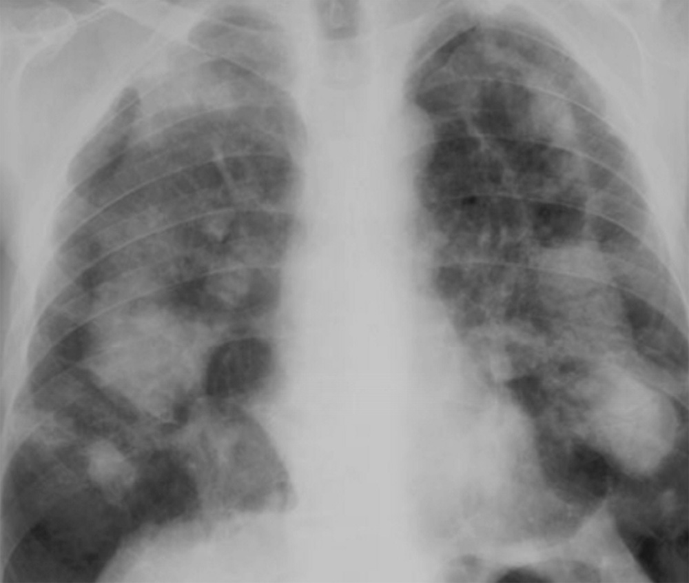 Рисунок 6. «Легкое шахтера» - прогрессирующий массивный фиброз. Определяются небольшие участки фиброза, в каждом легком визуализируется одно большое новообразование «гантелеобразной» формы. Наружные границы «гантелеобразных» образований имеют более четкие контуры, чем внутренние. Слева в верхнем отделе легкого в образовании сформировалась полость распада, вероятно из-за ишемического некроза, но можно предположить присоединение туберкулеза