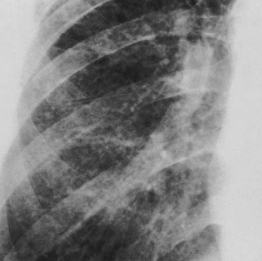 Рисунок 3. Силикоз. Увеличенный фрагмент рентгенограммы в прямой проекции – нижние отделы правого легочного поля. У больного в обоих легких определяются множественные, достаточно четко ограниченные милиарные узелки и диффузные ретикулярные изменения