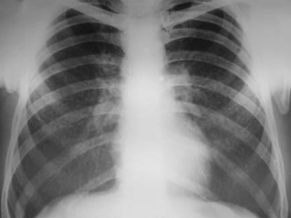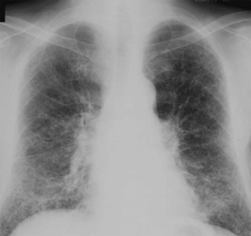 II стадия – в легких визуализируются множественные очаговые тени, размером от 5 до 10 мм – так называемая картина «снежной бури». Может определяться обызвествление узелков. Также отмечается выраженная деформация и усиление легочного рисунка с образованием ретикулярных теней (отметим, что на этом фоне сосудистый рисунок определяется плохо) (рисунок 1).