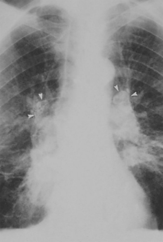 При асбестозе может образовываться плевральный выпот (см статью «Рентгенография: Гидроторакс») и определяться увеличение бронхопульмональных лимфатических узлов. В случае утолщения медиастинальной плевры и фиброзных изменений прилежащих к сердцу участков легкого, на рентгенограмме определяется неровный контур сердечной тени – симптом «волосатого сердца».