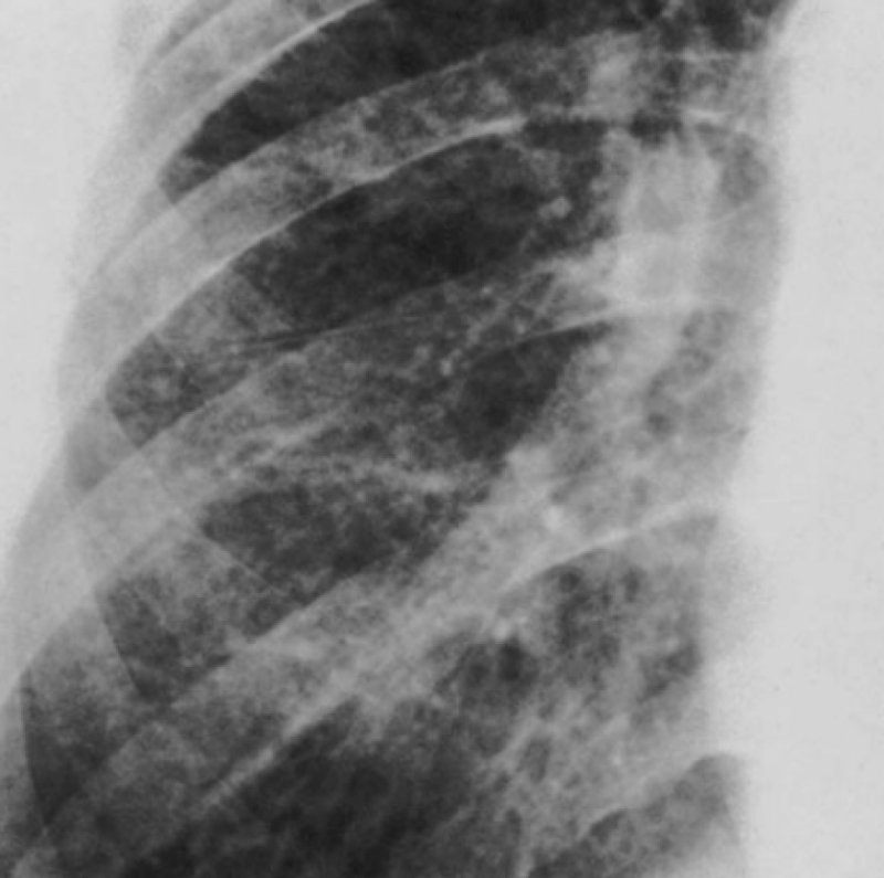 I стадия – на рентгенограмме определяется деформация и усиление легочного рисунка с образованием сетчатых (ретикулярных) теней. На этом фоне визуализируются немногочисленные мелкие узелки (очаги), размером до 2 мм. Такие изменения обнаруживаются преимущественно в средних отделах легочных полей.