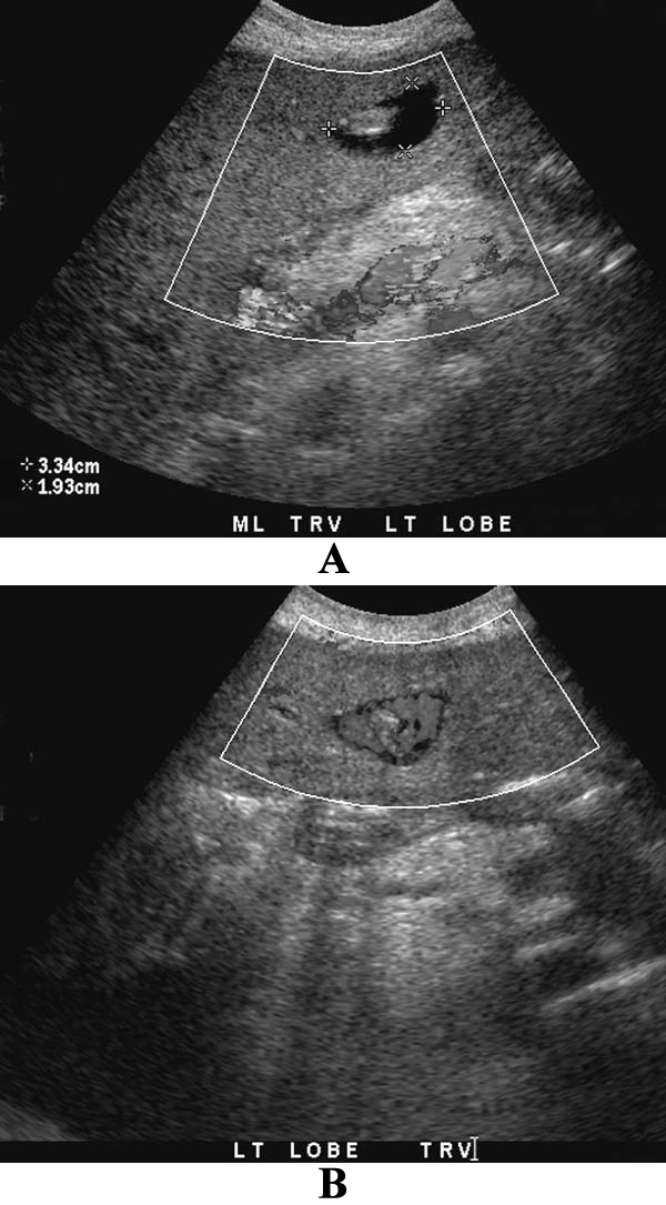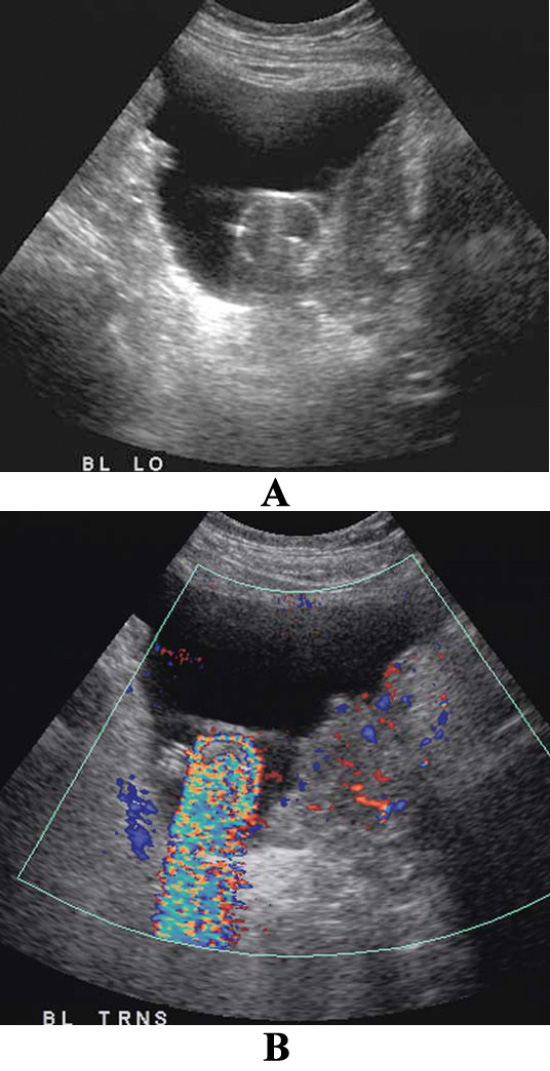 Фото 5. УЗИ брюшной полости: артефакт ложного потока при асците. А – поперечное изображение в режиме серой шкалы через серповидную связку отмечается анэхогенная жидкость, которая ее окружает. В – цветная допплерография демонстрирует окрашенную жидкость
