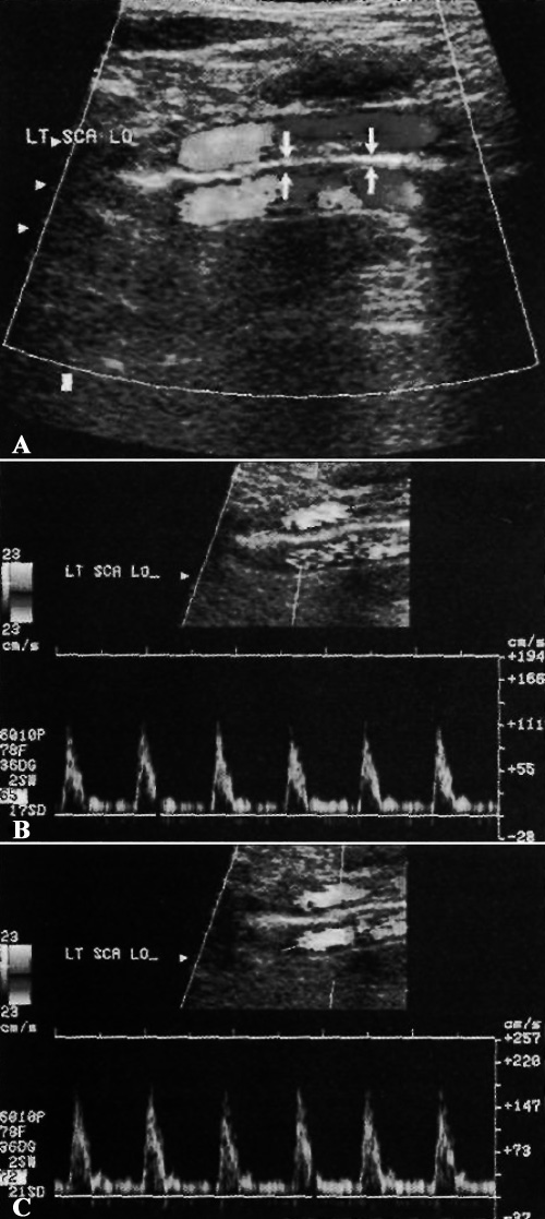 Фото 9. Допплерография подключичной артерии: артефакт зеркального изображения. А – на допплерограмме визуализируется нормальная подключичная артерия, при этом наблюдается вторая аналогичная артерия под поверхностью плевры (см стрелки). В – спектральный допплеровский сигнал истинной артерии не отличается от сигнала отраженной (зеркальной) артерии (фото С)