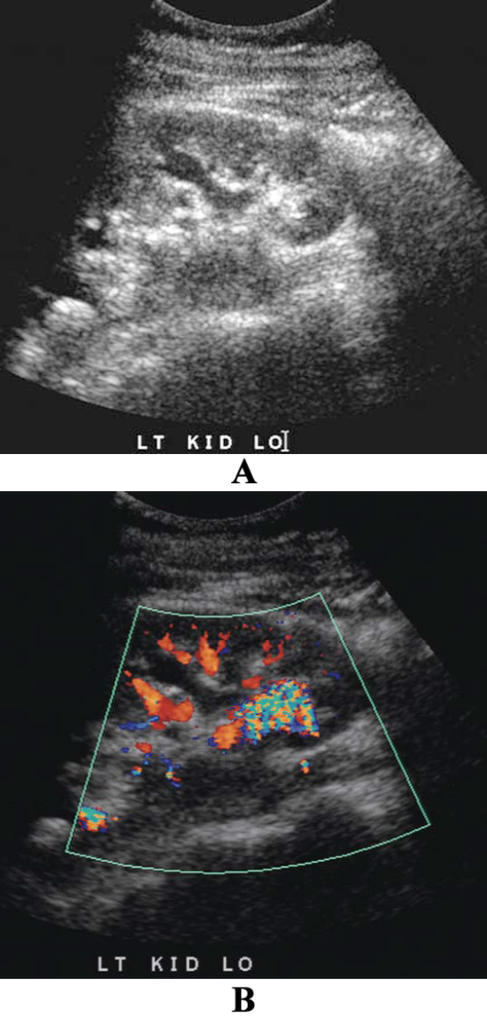 Фото 2. УЗИ почек: артефакт мерцания при камнях в почках. А – черно-белое изображение демонстрирует слабый эхогенный очаг в нижнем полюсе почки и еще один очаг – в верхнем полюсе почки. Эти очаги сложно отличить от синуса. Тени отсутствуют. В – цветное допплеровское исследование демонстрирует интенсивное мерцание (разноцветные пиксели) позади камней, также наблюдается нормальный цвет потока почечных сосудов. Камни в почках трудно диагностировать без обнаружения мерцания