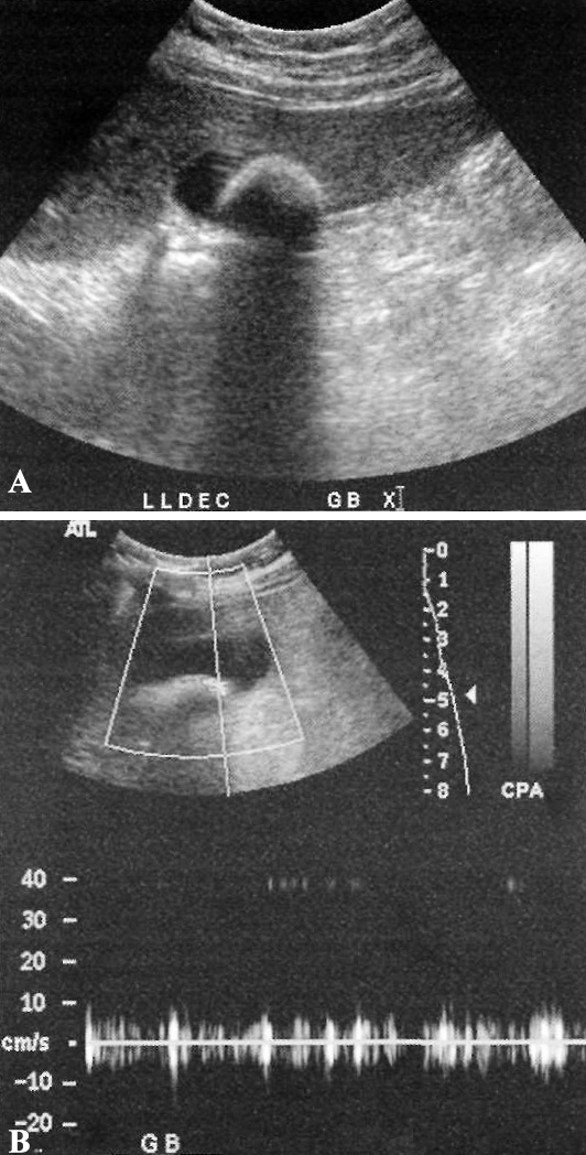Фото 7. Камень в желчном пузыре с краевым артефактом. А – черно-белое изображение крупного камня в желчном пузыре. В – усиленное допплерографическое изображение, на котором наблюдается имитация потока на поверхности камня. Спектральная запись на фото В демонстрирует только шум и отсутствие потока. Это характерно для цветной допплерографии и для усиленного допплеровского исследования.