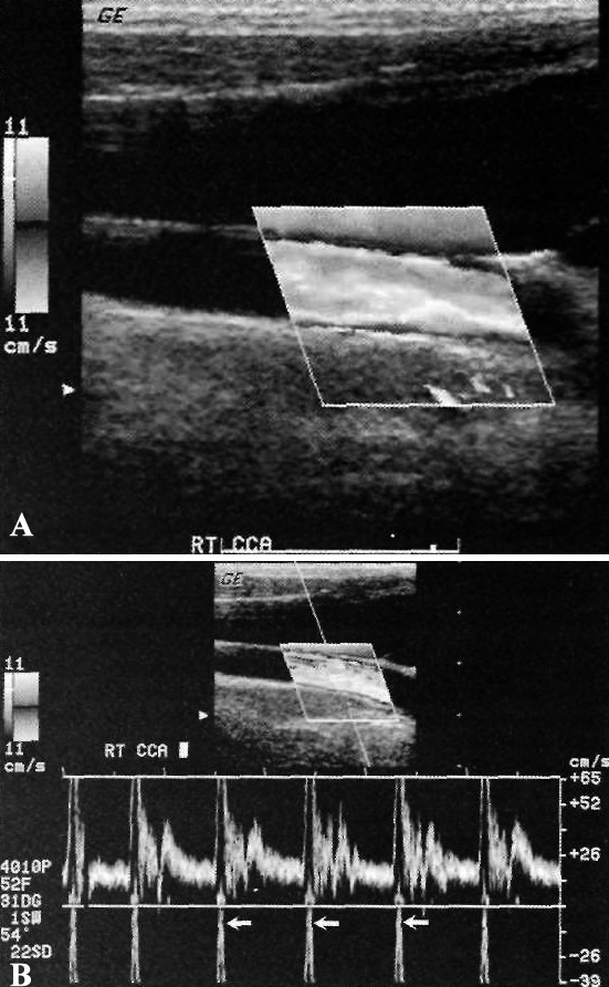 Фото 8. Допплерография сонной артерии: артефакт смешивания. А – допплерограмма общей сонной артерии в норме: поток направлен в сторону датчика, на изображении должен быть красный цвет; так как поток имеет большую скорость и расположен центрально (белый и желтый), он превосходит размер положительной части допплеровской шкалы, поэтому оборачивается с отрицательной стороны. В результате поток визуализируется как направленный от датчика, как в прилежащей яремной вене. В – спектральная допплерограмма общей сонной артерии в норме: небольшая шкала скорости, нормальный пик систолической скорости превосходит размер шкалы и оборачивается вокруг, выходя снизу