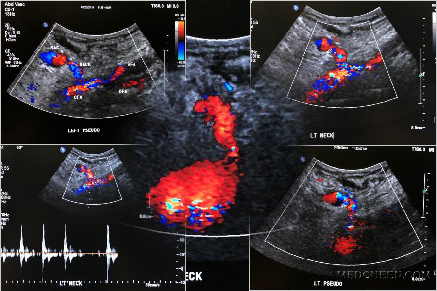 Для проведения исследования используют высокочастотный линейный датчик (5-7 МГц); если есть отек, применяют изогнутый датчик с частотой 3 МГц. Нужно сканировать окружающие ткани, окружающие аневризму, на предмет выявления множественных соединяющихся долек или артериовенозной фистулы. Дополнительные места соединения рекомендуется искать выше и ниже места соединения с артерией.