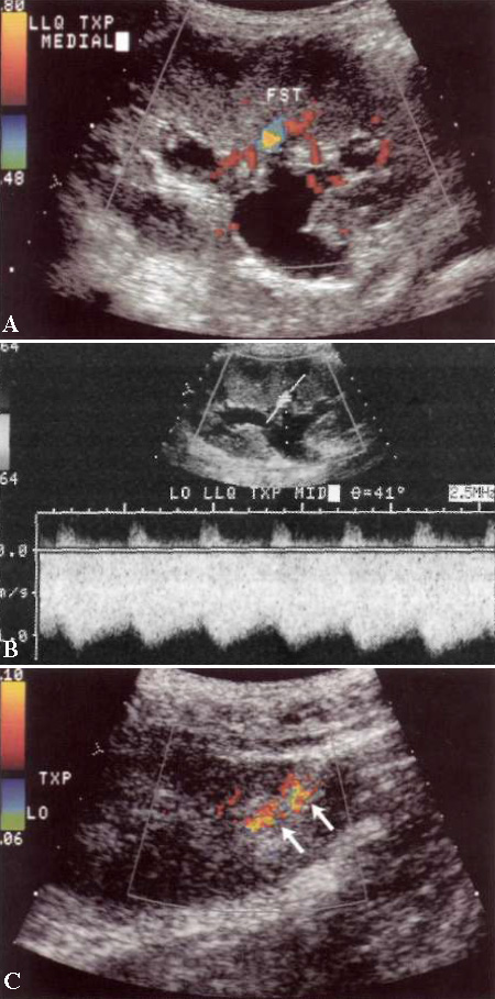 Фото 3. Артериовенозная фистула трансплантата почки. А – цветовая допплерограмма трансплантата почки в поперечной плоскости демонстрирует венозный кровоток высокой скорости (синий), возникающим на фоне других сосудов, которые являются артериями (красный), направленными к почке. В – спектральная допплерограмма демонстрирует венозный кровоток, скорость которого с коррекцией угла составляет 1 м/с. В этом случае нужно обратить внимание на артериальную форму волны в вене, которая немного замедлена по отношению к волне почечной артерии. С – артериовенозная фистула в области нижнего полюса трансплантата почки после проведения процедуры биопсии демонстрирует типичный допплеровский «шум» (разноцветные пиксели), что свидетельствует на турбулентность потока и вибрацию окружающей паренхимы. Реальный размер фистулы гораздо меньше, поэтому на УЗИ в режиме серой шкалы она не визуализировалась. У данного пациента фистула была бессимптомной и закрылась самостоятельно