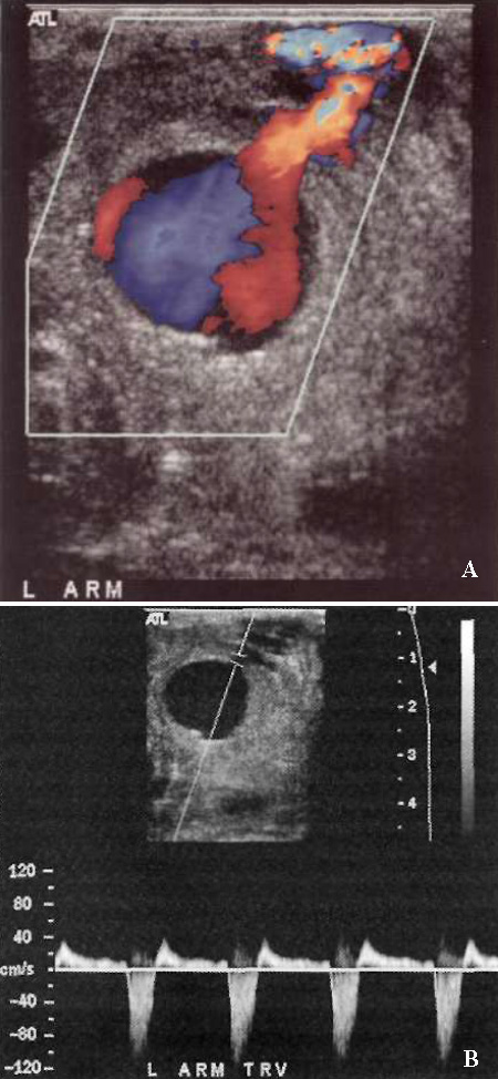 Фото 2. Ложная аневризма артериовенозной диализной фистулы. А – цветовая допплерограмма демонстрирует ложную аневризму, которая исходит из артериовенозной диализной фистулы. В – спектральная допплерограмма демонстрирует кровоток внутрь и наружу из аневризмы характерной двухфазной формы с полным обратным током в диастолу