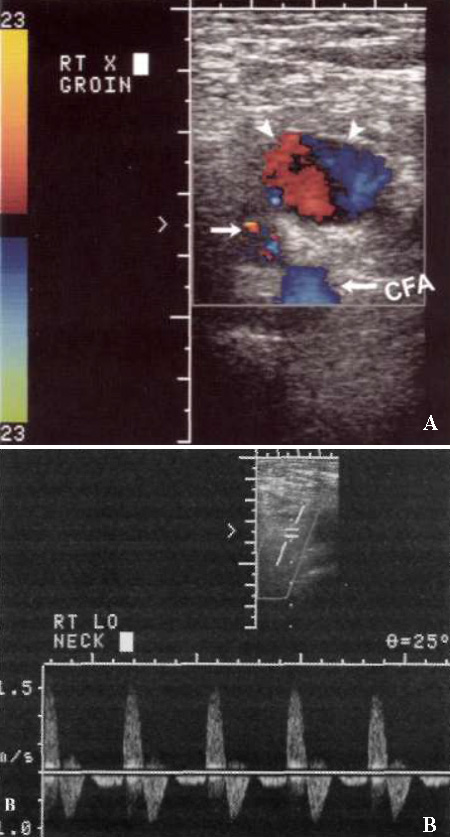 Фото 1. Ложная аневризма общей бедренной артерии. А – цветовая допплерограмма паховой области, выполненная в поперечной проекции: визуализируется общая бедренная артерия (CFA), стрелкой отмечена шейка аневризмы, указателями отмечена ложная аневризма, локализованная спереди, в которой наблюдается типичная картина «инь-янь» красного и синего цвета, что обусловлено завихрением кровотока. В – спектральная допплерограмма шейки ложной аневризмы подтверждает кровоток в обе стороны («туда-сюда»).