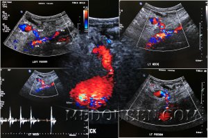 Под понятием «ложная аневризма» следует подразумевать скопление крови вне сосуда, сообщающееся с артерией через шейку, что приводит к завихрению кровотока внутри образования с характерной картиной на цветовой допплерографии. Исследование пульсовых волн ложной аневризмы показывает приносящий кровоток высокой скорости в момент систолы и длительный отток на протяжение всей диастолы (фото 1).
