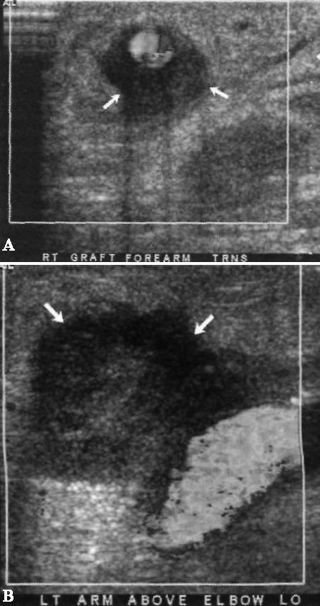 Фото 3. Гематома. А – стрелками обозначена гематома, окружающая просвет шунта. В – стрелками обозначена гематома, прилежащая к шунту