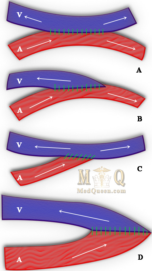 Фото 7. Варианты фистульного соединения артерии и вены. А – анастомоз «бок в бок». В – анастомоз «конец в бок». С – конец артерии соединен с боковой поверхностью вены. D – анастомоз «конец в конец»