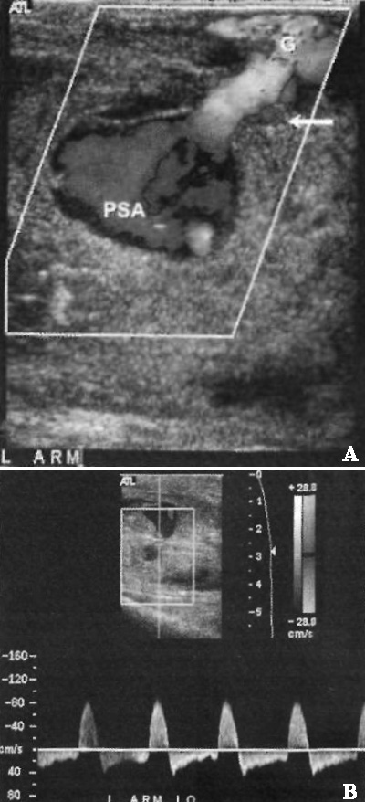 Фото 4. Ложная аневризма. А – цветовая допплерограмма шунта (G): стрелкой обозначена шейка, которая соединяет шунт с ложной аневризмой (PSA). В – спектральная допплерограмма шейки ложной аневризмы: наблюдается поток «туда-сюда», обусловленный наполнением и оттоком крови из аневризмы (сигнал регистрируют под нулевой линией)