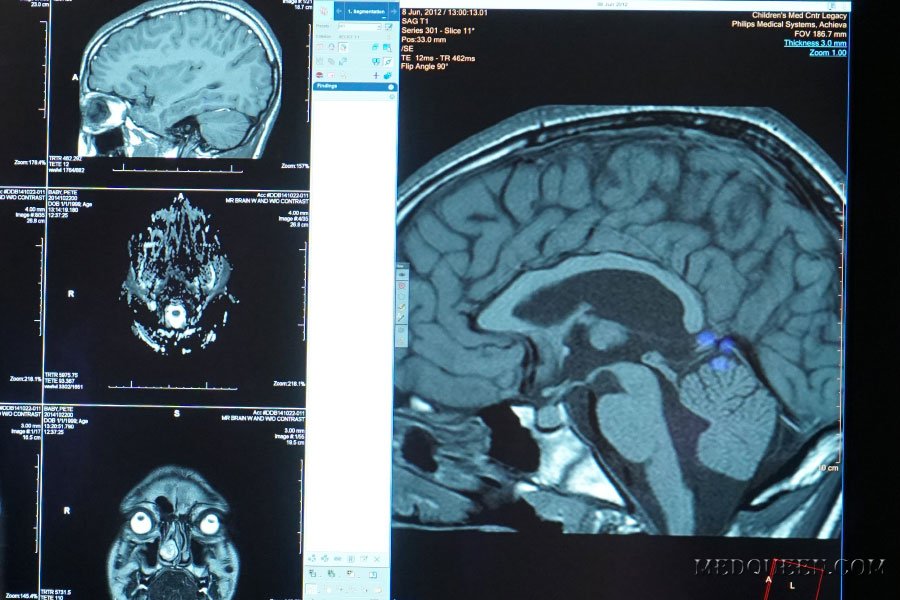 Визуализируется как пучок мелких вен, собранных в одну крупную вену — это сосудистая патология или аномалия головного мозга. Повышение артериального внутричерепного давления может привести к открытию опасного внутримозгового кровотечения. Также венозные ангиомы головного мозга являются причиной эпилепсии. МР-ангиография сосудов головного мозга является наиболее достоверным методом диагностики данной патологии.