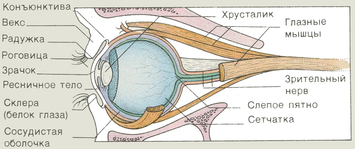 Органом зрения являются глаза, которые у зародыша развиваются из двух «почек», образующихся из головного мозга. Запечатленное изображение в виде нервных сигналов посылается в мозг, где они расшифровываются и создают зрительное восприятие. Глаз направляется на объект зрения шестью отдельными мышцами, которые вращают его в разные стороны. Острота зрения зависит от рефракции, или светопреломляющей способности, хрусталика и роговицы. Лучи света, попадая в глаз, фокусируются на сетчатке, и на ней образуется изображение.