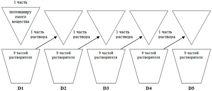 При приготовлении десятичных потенций 1 г лекарственного вещества растворяется в 9 частях носителя/растворителя и энергично встряхивается – т.о. получается D1. Далее берут 1 часть раствора из D1 и разводят в 9 частях носителя/растворителя и опять энергично встряхивают – в итоге получается D2 и т.д. Как результат, с каждым шагом разведения концентрация исходного действующего вещества уменьшатся в 10 раз.