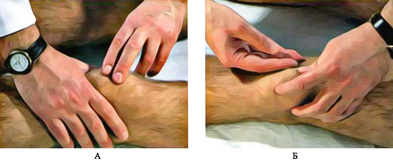 Незначительное количество выпота в коленном суставе определяется только с помощью пальпации. В этом случае применяю тест баллотирования надколенника (patella natans): одной рукой врач выдавливает жидкость из верхнего заворота, а II и III пальцем другой руки вдавливает надколенник в бедренную кость. Значительный выпот в коленном суставе при этом тесте сопровождается своеобразной амортизацией надколенника и его обратным движением к пальцам врача (рисунок 4А). Малые объемы скопления жидкости характеризуются наличием симптома выпячивания: одной рукой врач выдавливает жидкость из верхнего заворота, фиксируя надколенник указательным пальцем, и осторожным толчком другой руки между мыщелком бедренной кости и надколенником смещают жидкость сначала в одну, потом в другую сторону. Если в суставе присутствует жидкость, во время толчка возникает характерное выпячивание с противоположной стороны надколенника (рисунок 4Б).