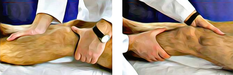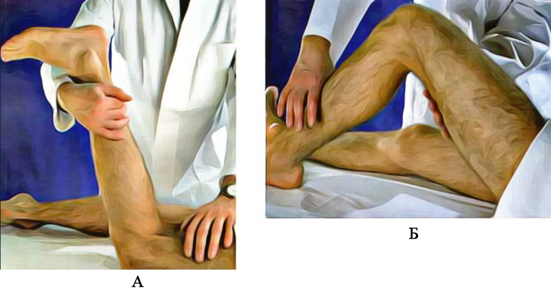Чтобы выявить повреждение крестообразных и коллатеральных связок применяют несколько скрининговых тестов. Исследование стабильности суставов проводится в состоянии умеренного сгибания. Для оценки состояния коллатеральных связок врач одной рукой проводит медиальное смещение бедра, другой рукой – латеральное смещение голени. При нестабильной медиальной коллатеральной связке отмечается чрезмерное смещение голени. Исследование латеральной связки проводится, соответственно, путем медиального смещения голени и латерального смещения бедра (рисунок 5).