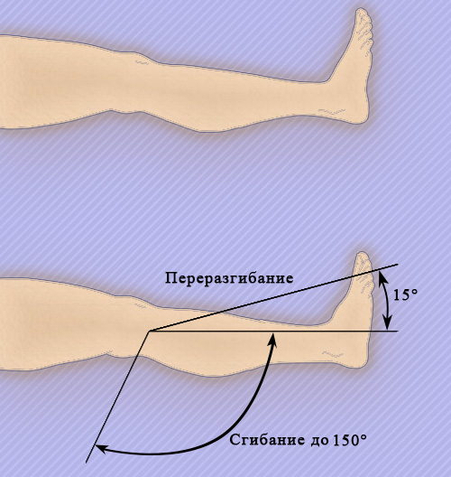 Оценка подвижности коленного сустава проводится в положении пациента лежа на спине. Амплитуда сгибания коленного сустава в норме составляет примерно 150°, также в норме может отмечаться незначительное переразгибание сустава.
