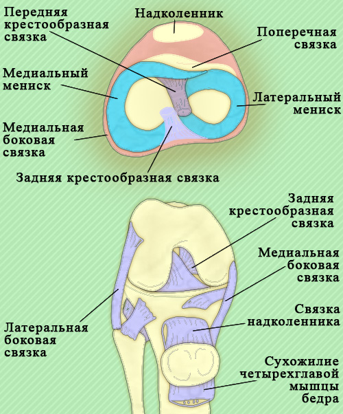 Капсула коленного сустава спереди укрепляется надколенником и сухожилием четырехглавой мышцы бедра, по бокам – латеральной и медиальной коллатеральными связками. Передняя и задняя крестообразные связки находятся внутри коленного сустава, они проходят от большой большеберцовой кости к латеральному и медиальному мыщелками бедренной кости. Крестообразные связки разделяются полость коленного сустава на передний и задние отделы, тем самым в определенной степени при патологии препятствуют распространению гноя из одного отдела в другой.