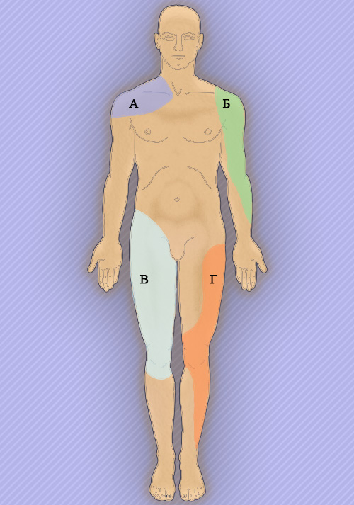 Рисунок 1. Локализация боли: А – патология грудинно-ключичного сустава и акромиально-ключичного сустава; Б – плечевого сустава, В – тазобедренного сустава, Г – коленного сустава
